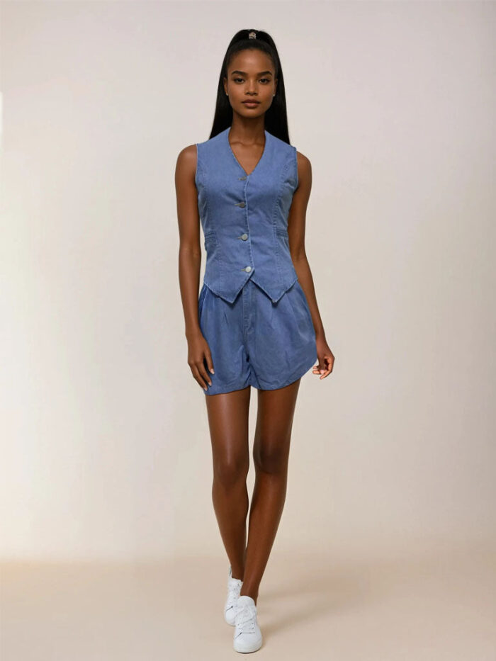 ? Design: Classic button-front vest and pleated shorts with side pockets.
