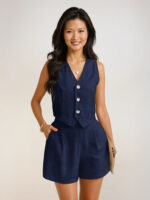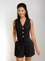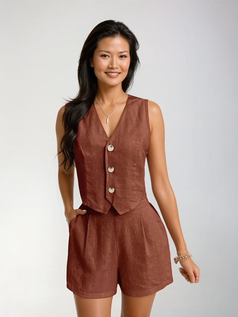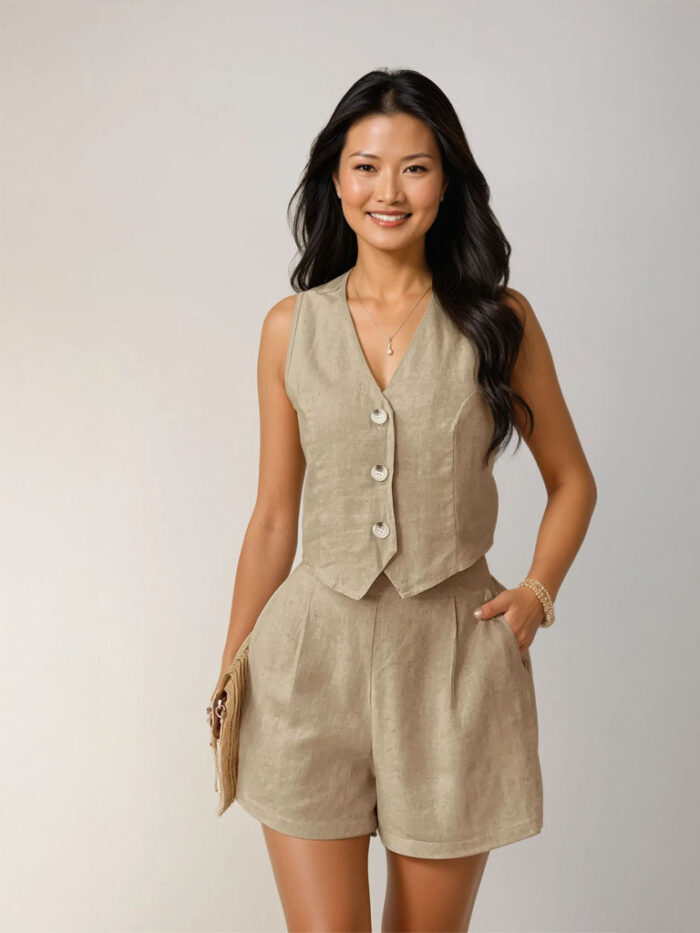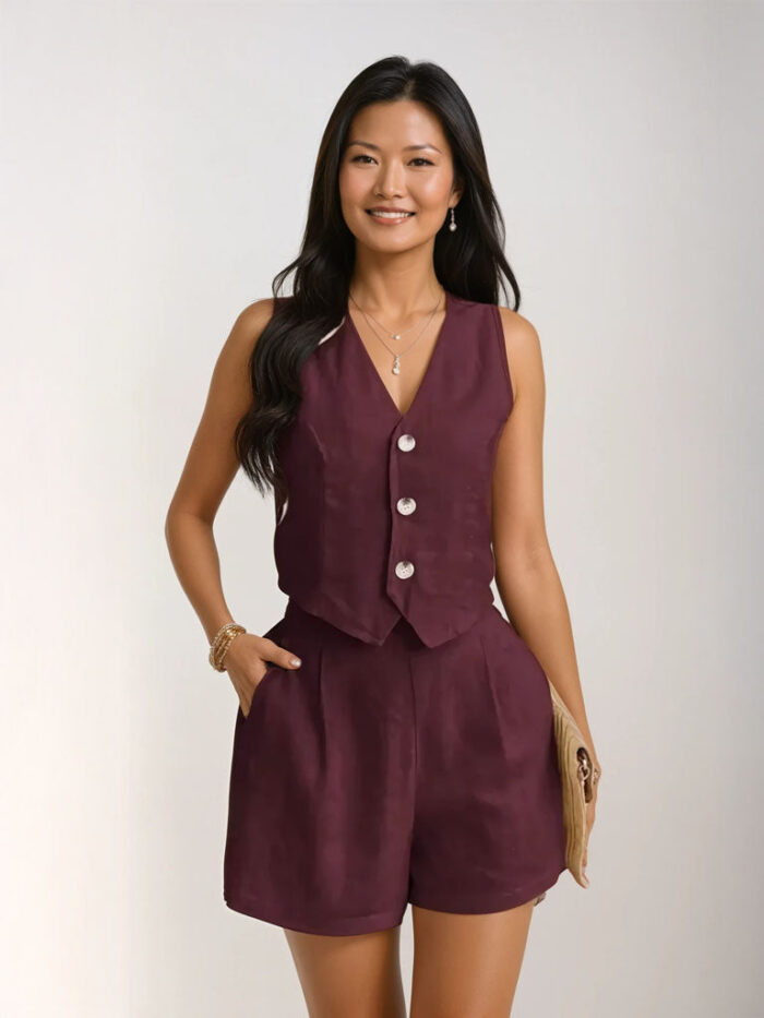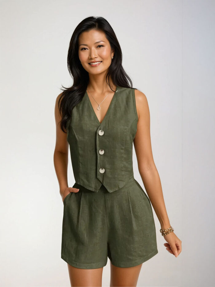 ? Design: V-neck sleeveless vest with shell-button front; high-waist shorts with pleats and side pockets.